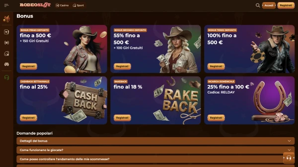 Il nostro principale bonus RodeoSlot per l’Italia è un pacchetto di benvenuto in tre depositi con un deposito minimo di €20 ogni volta. Primo deposito: 100% fino a €500 + 150 free spin. Secondo deposito: 55% fino a €500 + 100 free spin. Terzo deposito: 100% fino a €500. Il wagering è 35x sull’importo del bonus e non è richiesto alcun codice promo.