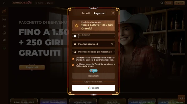 Creare un account è veloce e manteniamo il modulo essenziale. Una volta completata la registrazione, puoi depositare e iniziare a giocare, ma potremmo richiedere la verifica prima di un prelievo. Per accedere all’account, usa sempre la pagina ufficiale di login RodeoSlot per evitare siti clone. Se dimentichi la password, puoi reimpostarla dalla stessa schermata.
