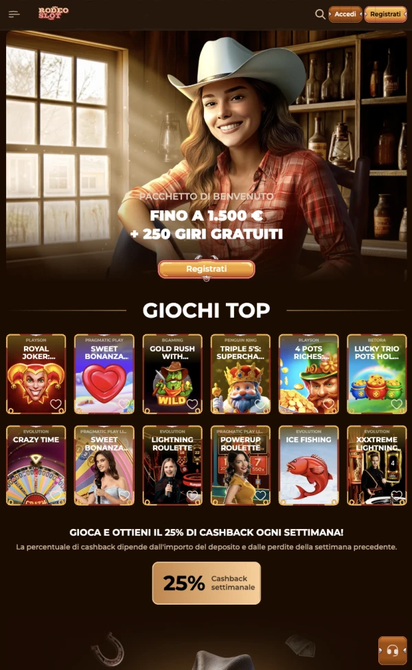 Quando scegli l’accesso casino RodeoSlot da telefono, hai comunque gli stessi strumenti di pagamento, impostazioni di gioco responsabile e pagine promozionali. Molti giocatori apprezzano anche il fatto che RodeoSlotCasino funzioni direttamente nel browser, così gli aggiornamenti avvengono automaticamente quando miglioriamo il sito.